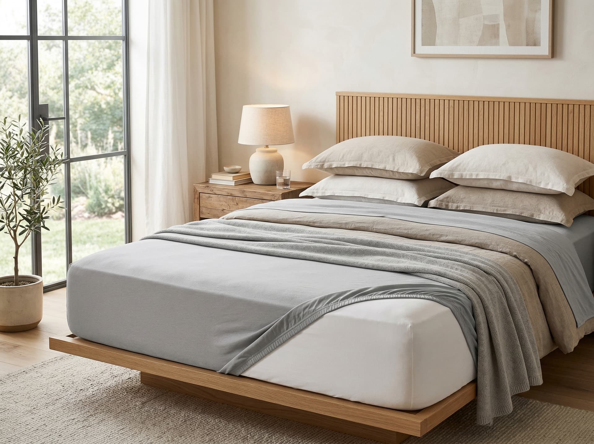 Bielastisches Jerseygewebe aus 47,5% Baumwolle, 47,5% Modal und 5% Elastan. Dehnt sich in beide Richtungen — hält auch bei unruhigem Schlaf faltenfrei. Passt auf Matratzen von 6 bis 35 cm Höhe. Bei 60°C waschbar, trocknergeeignet und formstabil nach vielen Wäschen.